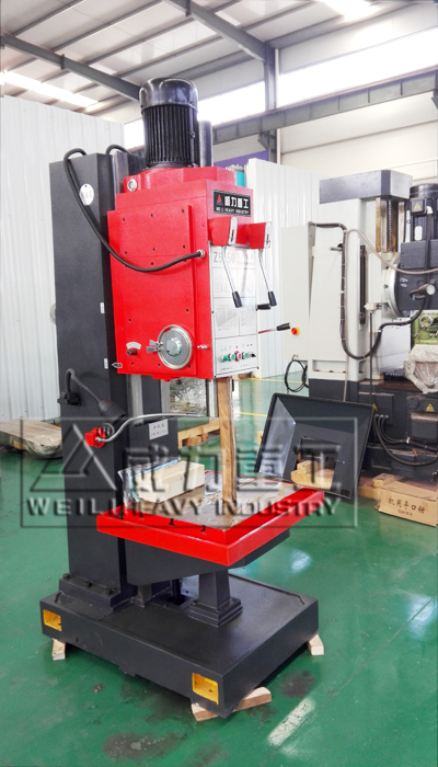 【產(chǎn)品描述】:立式鉆床 主軸豎直布置且中心位置固定的鉆床,簡稱立鉆。常用于 機(jī)械制造和修配工廠加工中、小型工件的孔。 立式鉆床加工前,須先調(diào)整工件在工作臺上的位置,使被加工孔中心線對準(zhǔn)刀具軸線。加工時(shí),工件固定不動(dòng),主軸在套筒中旋轉(zhuǎn)并與套筒一起作軸向進(jìn)給。工作臺和主軸箱可沿立柱導(dǎo)軌調(diào)整位置,以適應(yīng)不同高度的工件。 立式鉆床作為鉆床的一種,也是比較常見的